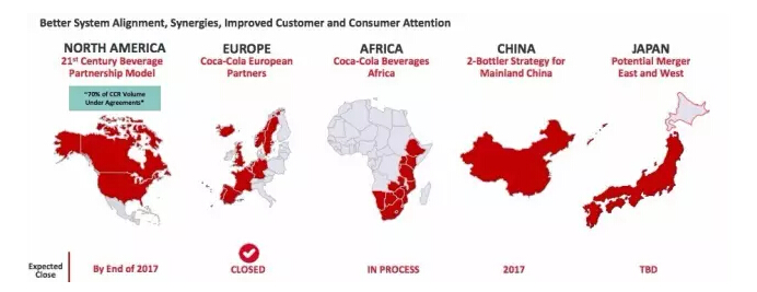 首先,咱们带大家过一下当中的硬新闻部分。在谈及可口可乐目前正在加速装瓶业务的重新特许经营时,James Quincey向分析师展示了5个地区的装瓶商整合地图,包括了并成为“双装瓶商战略”的中国大陆地区,并明确标注完成时间是2017年。