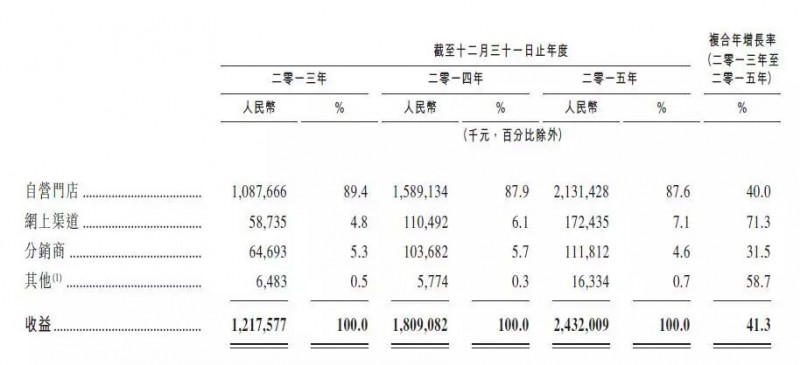 2013年~2015年总收益分别为12.18亿元、18.09亿元、24.32亿元,年复合增长率为41.3%。其中,自营门店占比超80%,网上渠道增长最快,年复合增长率达到71.3%