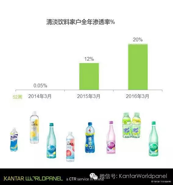 根据凯度消费者指数对中国城市家庭购买快消品的连续性调查发现,越来越多的消费者愿意购买清淡饮料。过去一年,有20%的家庭购买过清淡饮料,而一年前,只有12%。