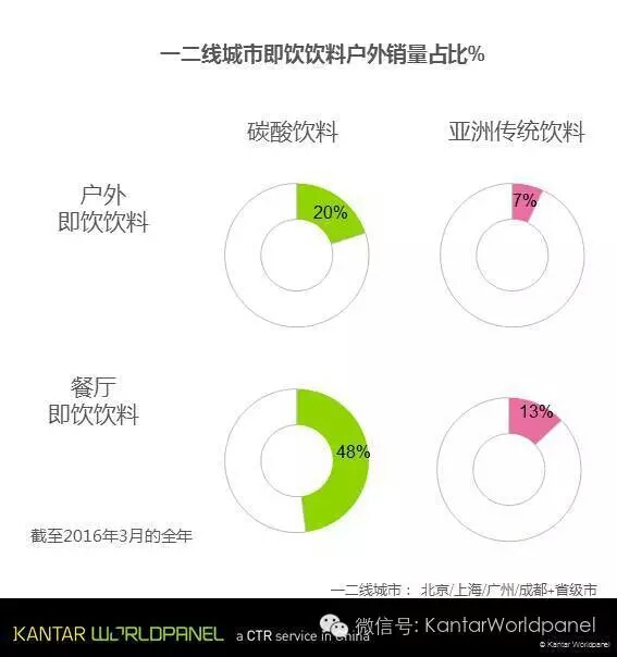 不过,清淡饮料也不是处处皆得宠。凯度消费者指数针对一二线城市户外饮食消费的调查发现,在餐厅,碳酸饮料仍然占据了近半壁江山,清淡饮料在这一消费场所还是比较沉寂。