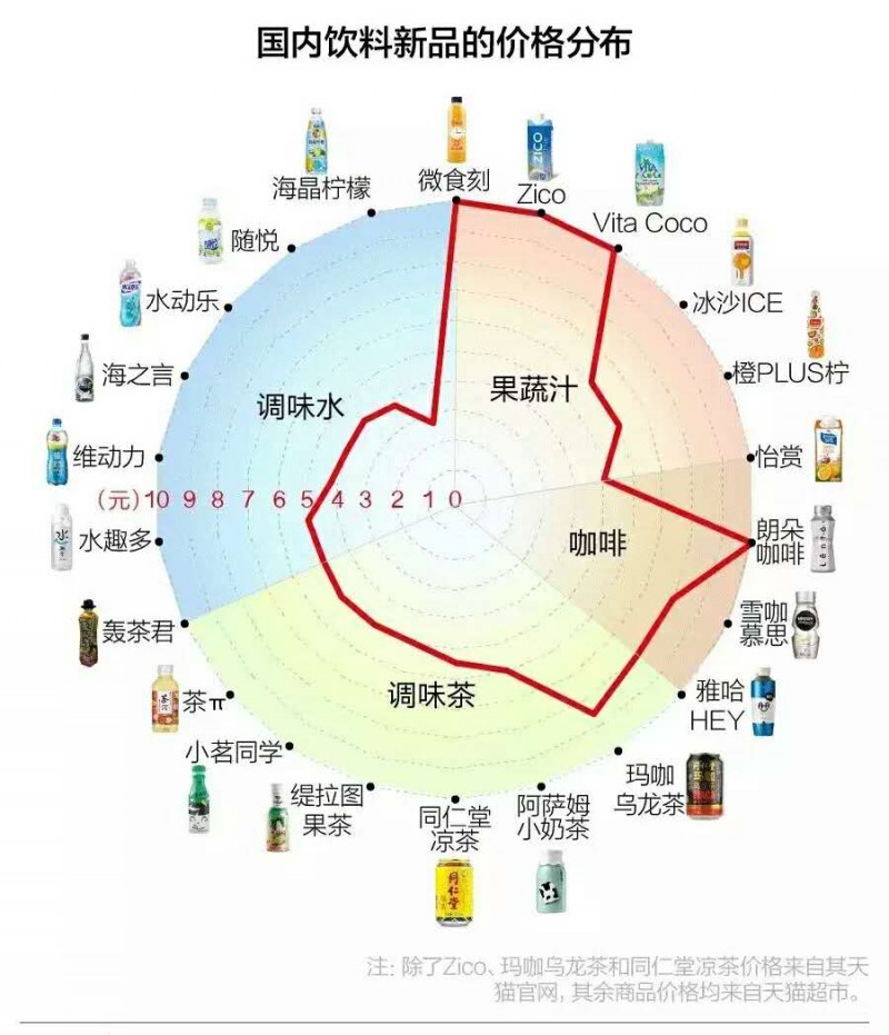 即饮咖啡和果蔬汁普遍价位较高,调味茶其次,最后是调味水——价位在4元左右,只是咖啡类的一半。