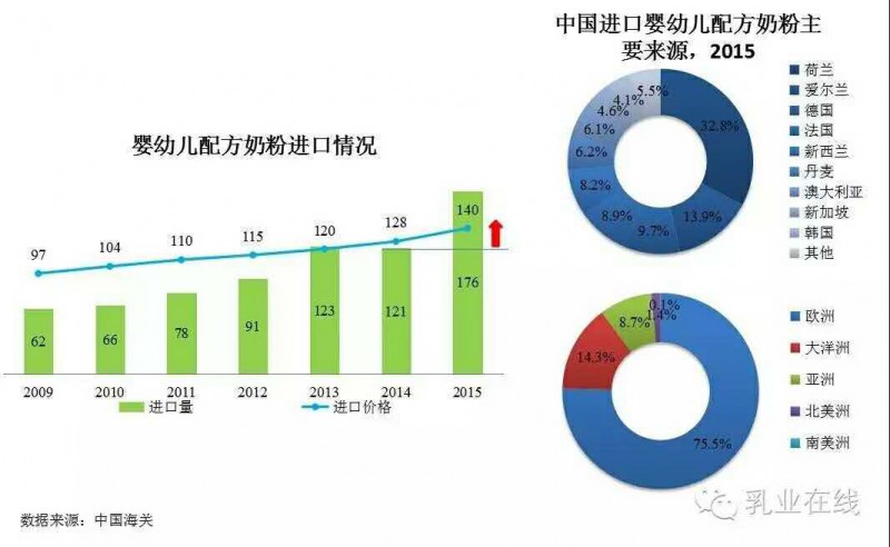 1.3中国婴幼儿配方奶粉进口量价齐升,以欧洲进口为主,德国、澳大利亚和荷兰进口量增幅最大。
