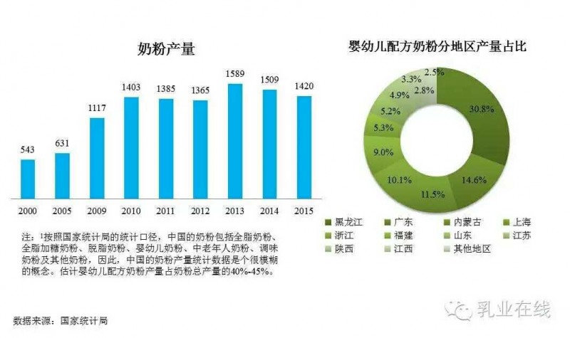 1.4 2015年中国奶粉产量为142万吨,估算婴幼儿配方奶粉产量约为64万吨左右,黑龙江仍为第一大生产基地。