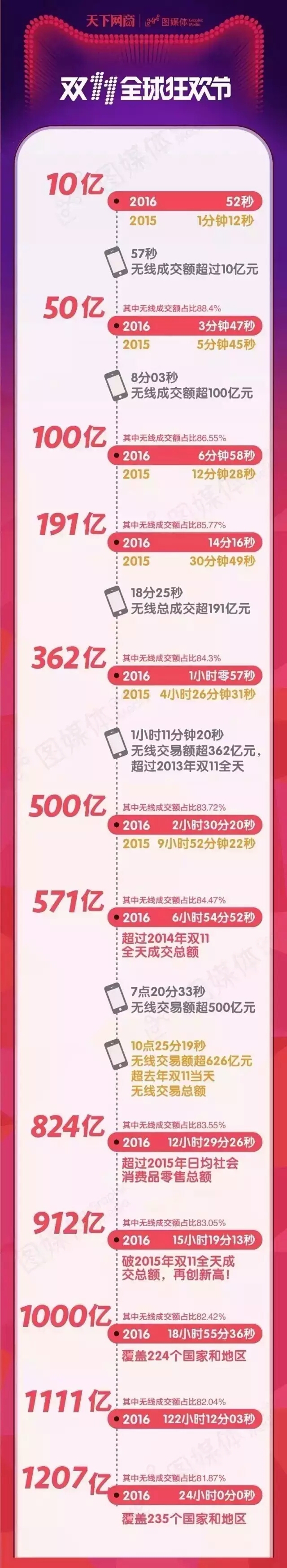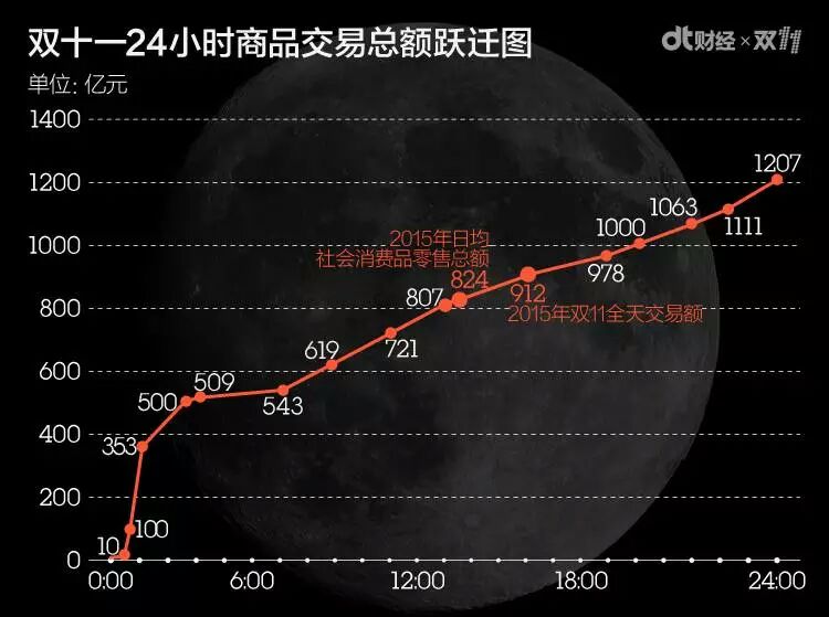 整整24小时,双11全球狂欢节现场的大幕一直在滚动,数字从0到1207亿。14分钟,2012年被甩在身后;1小时,2013年被甩在身后;6小时54分,2014年被甩在身后;15小时19分,2015年被甩在身后。