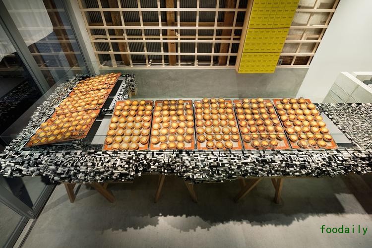 Bake 的大多数店铺都开在地铁站内或商场餐饮集中的地方,每家店铺的设计都会将蛋挞摊开放在台面上,透过玻璃,人们可以清晰地看到室内的场景。