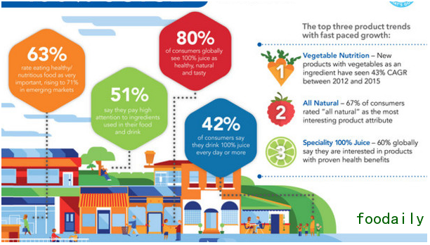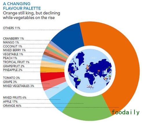 报告指出,在口味方面,橘汁仍然位于主导地位,2015年的销售量达到69亿升,占100%果汁市场的46%。苹果汁位列第二位,占总销量的17%,但同时也出现了缓慢下降的趋势。符合健康需求的混合蔬菜汁上升至第四名。