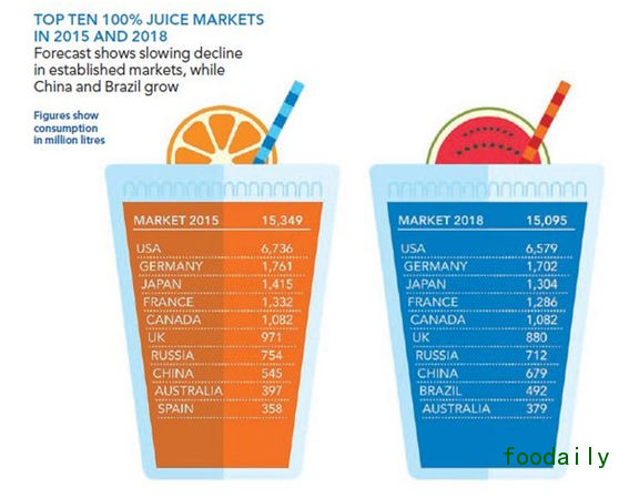 “预计到2018年,中国市场会有7.7%的复合年增长率,但是仍会被巴西超过。到2018年,巴西会进入世界前10。拉丁美洲地区果汁市场增长强劲,在过去3年中年增长率达到12%,位列第一,这种增长源于中产阶级开始放弃家庭自制果汁,转而选择包装果汁。”