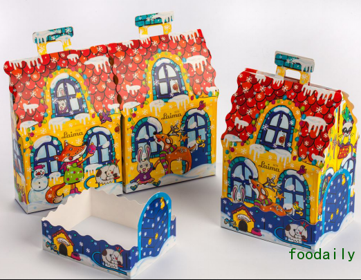 圣诞小屋仅用一片纸板制成,可以从中间拆开,供孩子们玩耍。而埃菲尔铁塔形状的纸盒因其‘华丽的冷烫锡箔表面’获得青睐,从而使销售量大增。从底部填料,然后封口,再穿一根便于携带的绳带。