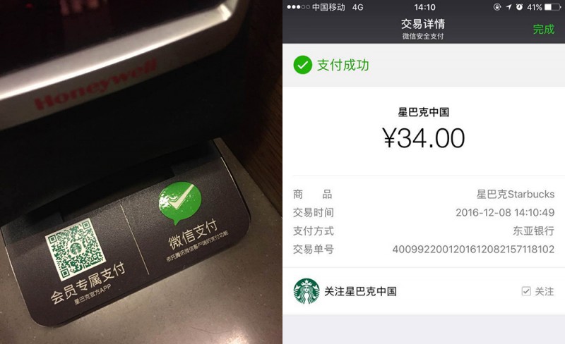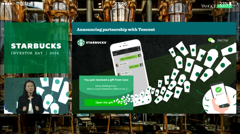昨天半夜的消息,星巴克中国区——包括统一管理的江浙沪地区在内已经正式全面支持用微信移动支付。刚被任命星巴克中国首席执行官的王静瑛在星巴克西雅图总部的投资者会议(Investor Day)上介绍了星巴克在中国的情况,包括目前中国的开店情况、云南一位伙伴的故事,当然,最大也影响最广的就是宣布和腾讯的合作——从今天(8日)开始,在全部门店开始支持微信支付。