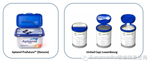为了捕捉到消费者对婴儿食品安全的顾虑,品牌以及包装生厂商开始投资创新性的密封盖,不仅具备功能,同时安全。16年的夏天,达能Aptamil在西欧发行了一款加强版的标准功能性奶粉配方---Aptamil Profutura™(图片如下)。除了额外的成分,包装—安全盒,是另一个主要的卖点,来迎合有顾虑的父母。800g的薄壁容器包装拥有一款可以上锁的塑料分配系统,有一个防揭封条,和内部箔,防止伪造和首次使用的污染。勺子,在盖子的上面,可以在生产过程中,可以预防对产品的污染。在角落的地方,还有专门放勺子的位置,方便父母准备奶粉的时候使用。