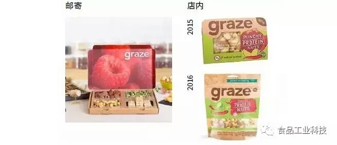 Graze品牌提供个性化产品。消费者选择四样零食放在四个格子的包装中。包装盒的设计能让它能进出邮筒,打开时,里面的零食摆得很好看。近期品牌已延伸到了零售店渠道。