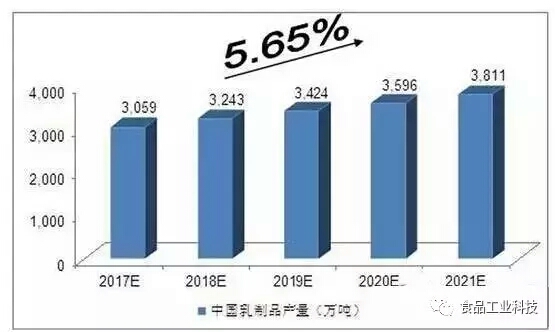 综合以上因素,据2017年中国乳制品行业现状及发展趋势分析预计,2017年我国乳制品产量将达到3,059万吨,未来五年(2017-2021)年均复合增长率约为5.65%,2021年产量将达到3,811万吨。