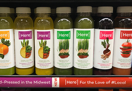 Here系列产品包括果蔬汁、蘸酱以及调味汁等,食材配料均来源于美国中西部地区的农场