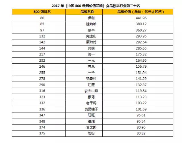 6月22日,由世界品牌实验室主办的第十四届“世界品牌大会”在北京举行,会上发布了2017年《中国500最具价值品牌》,其中食品饮料业依然是入选品牌最多的行业,共有82个品牌入选,占总入选品牌数的16.40%。