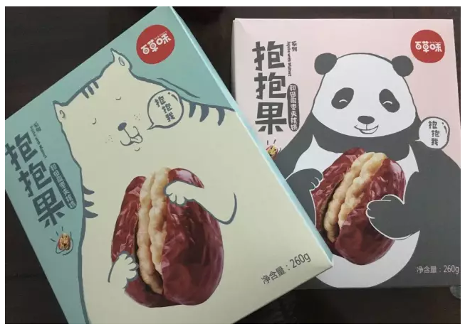包装的重要性不言而喻,许多零食企业不仅因为包装设计中煞费苦心,甚至不惜重金打造了企业独有的IP文化。例如三只松鼠,经过多年的IP打造后,三只小松鼠的动漫形象跳出了产品包装,成为一个独有的IP出现在消费者的周围。同样主打治愈系的百草味“抱抱果”,更是将萌系包装发挥到极致,引得其他企业纷纷效仿,导致一定的同质化现象。