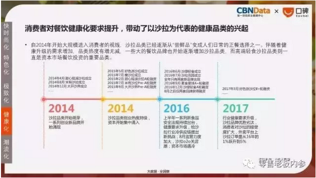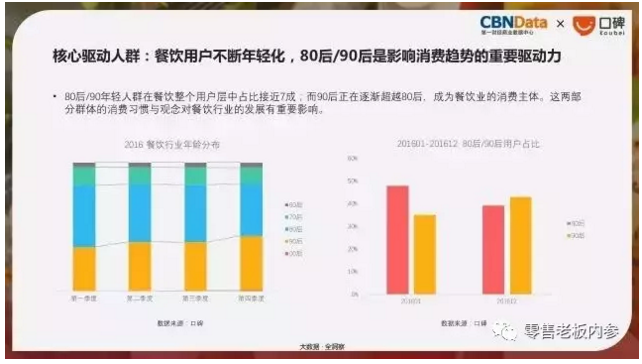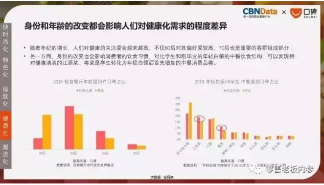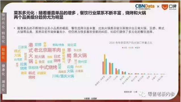 6月27日,阿里巴巴旗下本地生活服务平台“口碑”联合第一财经商业数据中心(CBNData)联合发布了《2017中国餐饮消费报告》。这份报告其中总结了已经出现的2017年餐饮流行的新趋势。这份报告总结了五大趋势:1 快时尚化,2 特色化,3 极致化,4 健康化,5 潮流化。并且对8090后消费人群的特点进行了分析。