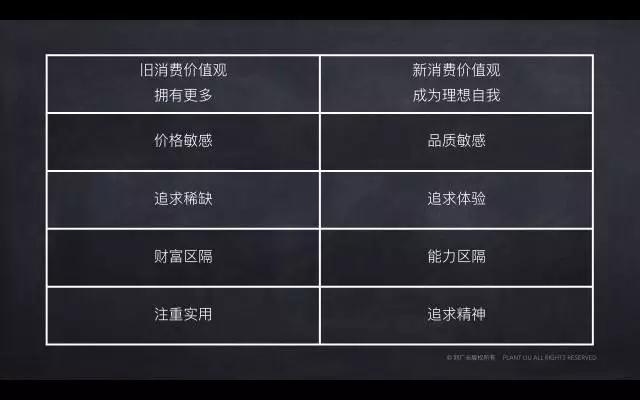 现代经济学认为,随着经济发展,人均GDP每进入某个新阶段,就会引发消费偏好的变化。所以,消费升级,不是消费品的升级,而是消费者价值观的升级。“有钱了后买两辆宝马车,开一辆拖一辆”这样的简单在消费数量上的和价格上升级的逻辑,根本上来说属于上个消费时代的消费价值观。