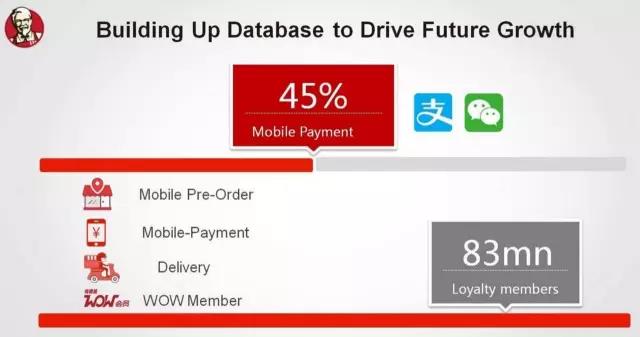据透露,自2015年7月开始进入的移动支付,目前占百胜中国总销售额的比例已超过40%;无现金支付总额在第二季度达到9亿美元。屈翠容提到,第二季度,超过45%的肯德基销售是通过移动支付完成的,是去年同期的两倍以上。