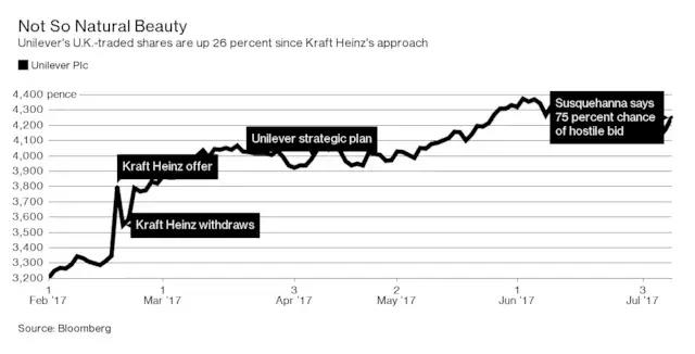 实际上,如果卡夫亨氏如果还想要收购联合利华,他们必须提出更高的收购价格。自从卡夫亨氏提出收购至今,联合利华在伦敦的股价已经上涨了26%,而且当时联合利华拒绝收购的原因之一就是价格“严重低估了公司的价值”。