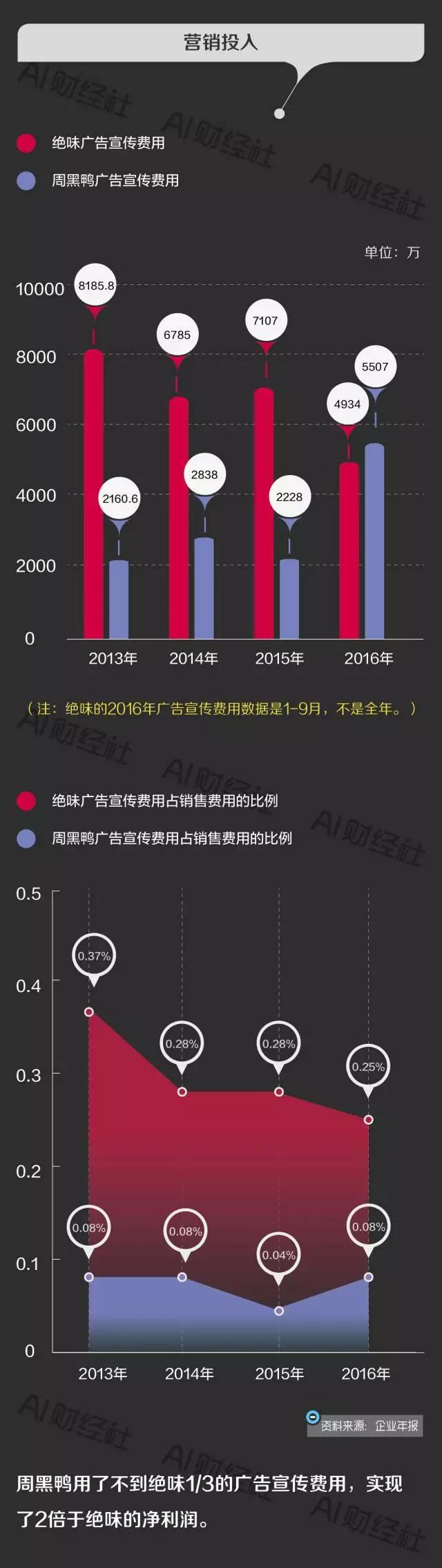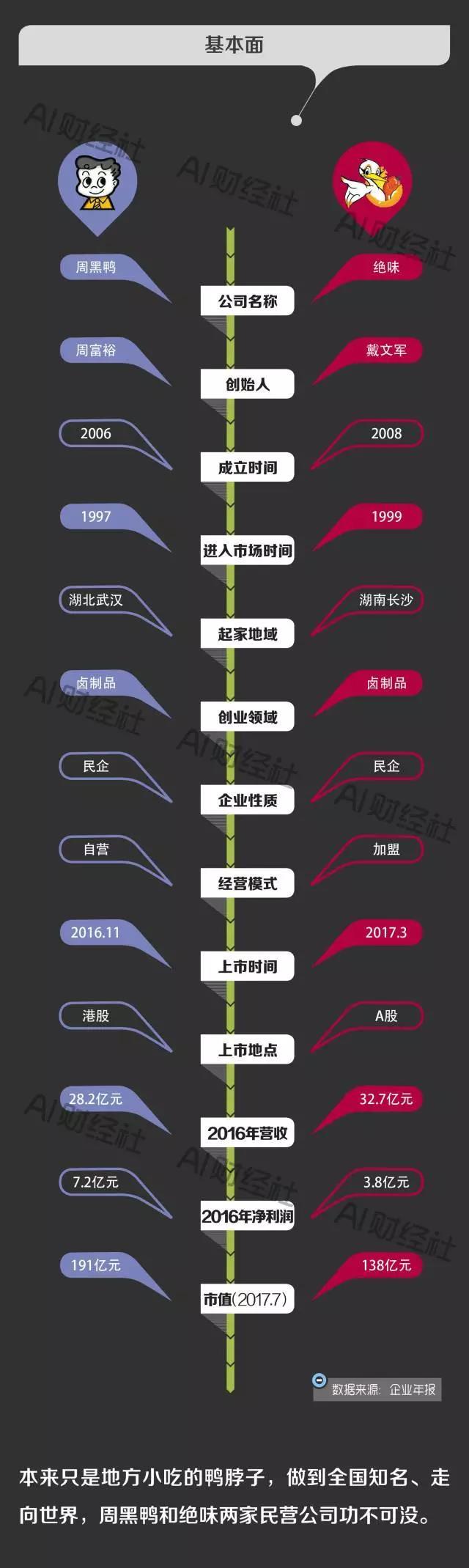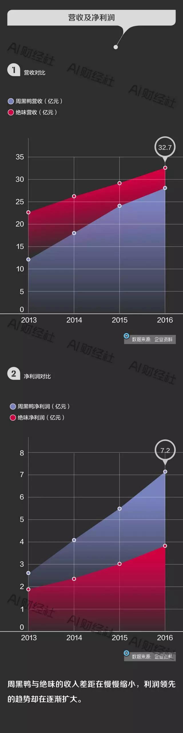 绝味和周黑鸭虽然成立时间不同,但主打产品都是鸭脖。2016年,绝味的店铺数量10倍于周黑鸭,销量3倍于周黑鸭,收入也是周黑鸭的1.5倍,但利润只有周黑鸭的50%。两家公司有何不同?