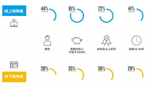 超过一半的消费者(64%)年龄在18至35岁之间,却只有45%左右的线下消费者属于这一年龄区间。另外,网络购物者中有77%的受访者拥有大学学士以上的学位—明显高过于线下购物者的41%。