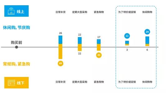 将近24%…的消费者表示他们喜欢在线上“休闲购物”,而11%的受访者说他们会在特定假期期间通过网络平台抢购特价商品。一半的消费者会在实体店面进行“日常补货”,而20%的购物者会到店面进行“紧急购物”—…购买迫切需要的商品 。