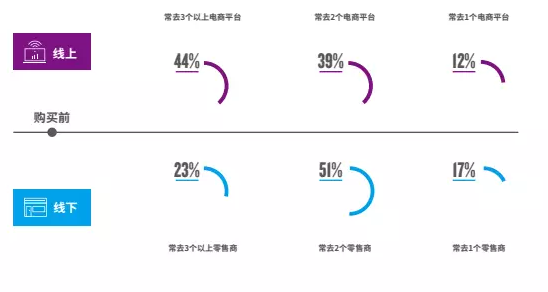 企业在设计渠道策略时,必须基于顾客购买地点的数据:大部分的网络购物者说他们会经常访问三个以上的电商平台(44%),而线下消费者一般固定到两家实体零售商店购物(51%)。即使电商不断成长,网络购物仍然不能舍弃实体渠道。