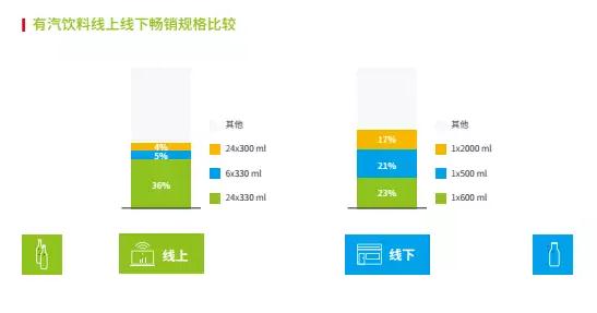 为线上与线下渠道设计出不同的包装规格,细微的促销战略,可以带动整体销量的增长。根据尼尔森的线上零售监测数据,同一个品牌的有汽饮料在线上以24瓶330ml(36%)售卖时,销量竟远高于6瓶330ml(5%)或24瓶300ml的组合(4%)。