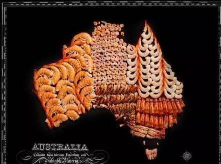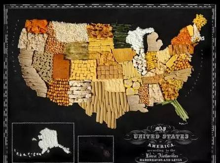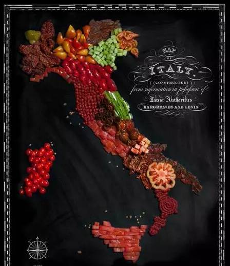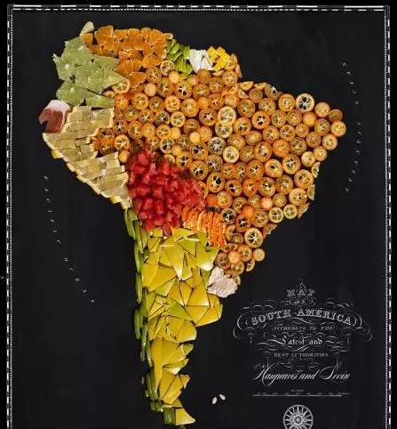 用各国人民最爱吃的食物拼起来的版图,你可能会看到意大利人爱吃的西红柿,美国人喜欢吃的玉米,还有日本人的还带,甚至中国的面条之类的美食。
