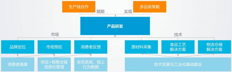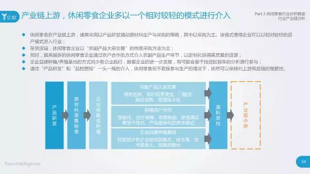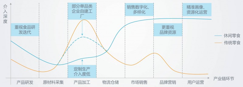1. 产业链上游,休闲零食企业多以一个相对较轻的模式进行介入完成产品研发,通过“产品研发”和“品控质检”一头一尾的介入,企业在不直接参与生产的情况下,依然可以保持对上游供应链的强管控。