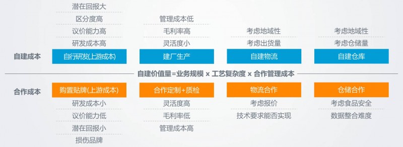 2. 产业链中游以“价值”为核心,以工艺复杂度和单品最高销量决定食品的加工生产环节采用自建或对外合作定制生产模式。当投资自建工厂、物流、仓储的长期收益超过合作定制开销、质量风险和沟通成本时,企业通常选择自建工厂;当合作定制生产可使产能和投入实现最优组合配置时,则得益于产业链各环节的成熟,企业可以选择对外合作。