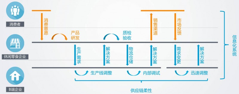 柔性供应链,让企业可以快速对休闲零食企业的需求变更做出响应,低成本调整生产线,满足碎片化、小规模、多样化生产需求,进而实现当下“新零售”语境中的C2B或S2B的生产模式。