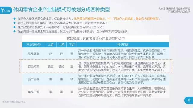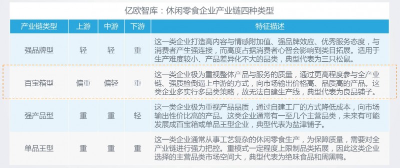 根据侧重点不同,休闲零食企业产业链可分为四种模式:强品牌型、百宝箱型、强产品型、单品王型。