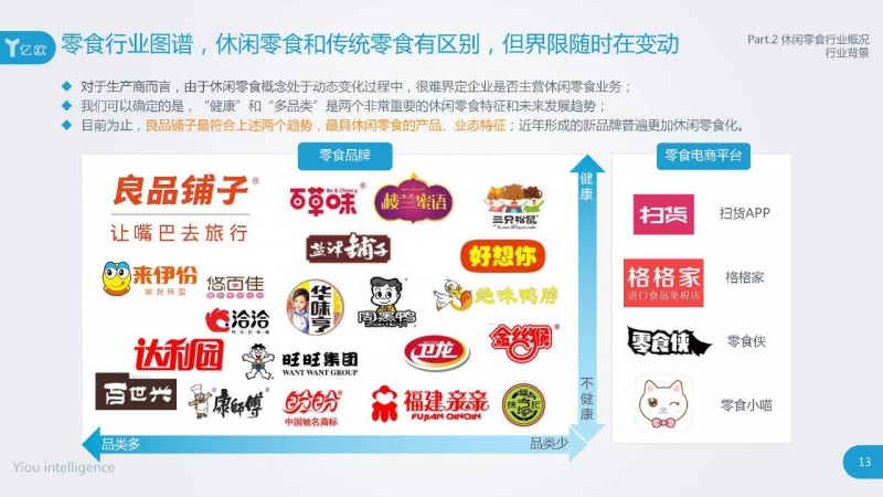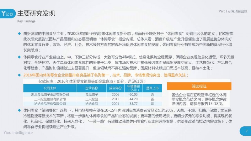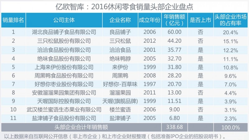 需要说明的是,此次盘点的企业,均为在亿欧智库此次报告休闲零食定义范畴内的本土的、伴随现阶段休闲零食行业大发展成长起来的企业,以及正在明显发力向休闲零食领域进军的企业。