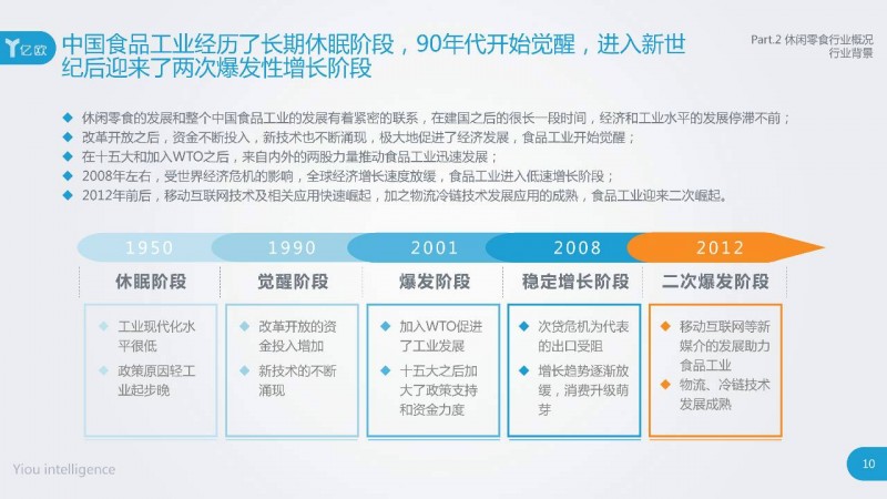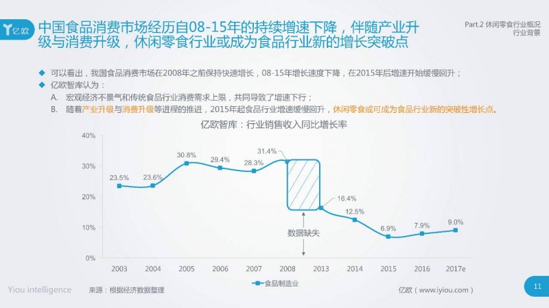 曲折发展的中国食品工业,于2008年迎来了本土休闲零食新业态。宏观经济和传统食品行业消费需求,共同导致了长年的食品行业增速下行;随着产业升级与消费升级等进程的推进,2015年起食品行业增速缓慢回升。亿欧智库认为,休闲零食或可成为食品行业新的突破性增长点。