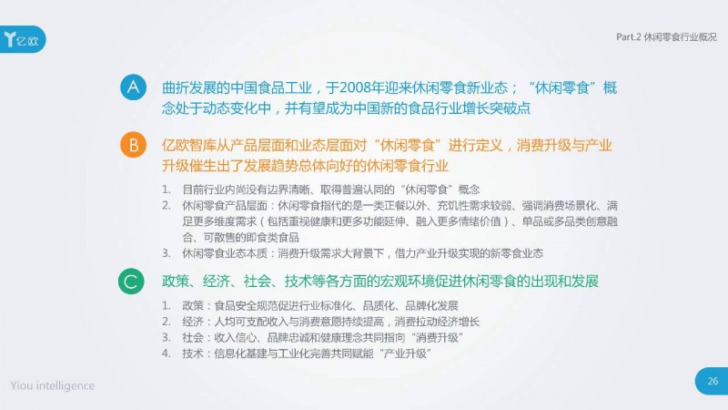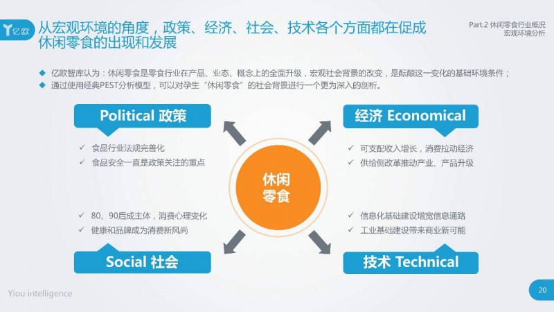 政策、经济、社会、技术等各方面的宏观环境促进休闲零食的出现和发展。