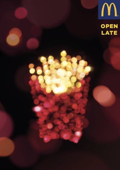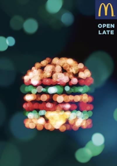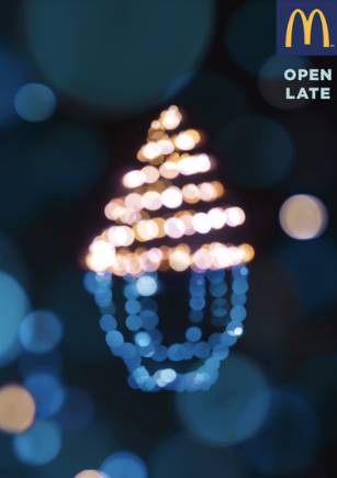 麦当劳最新的一组营销“点亮”了那些在深夜里营业的麦当劳门店。用1100块LED,80米的电线,做了一个五彩斑斓的汉堡!