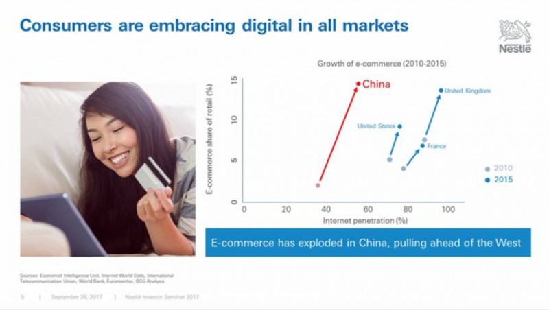 她表示,中国就是一个很好的例子,电商的规模极其庞大,雀巢的合作伙伴之一京东触达超过9400万中国消费者,90%的快递都是当日或次日送达。