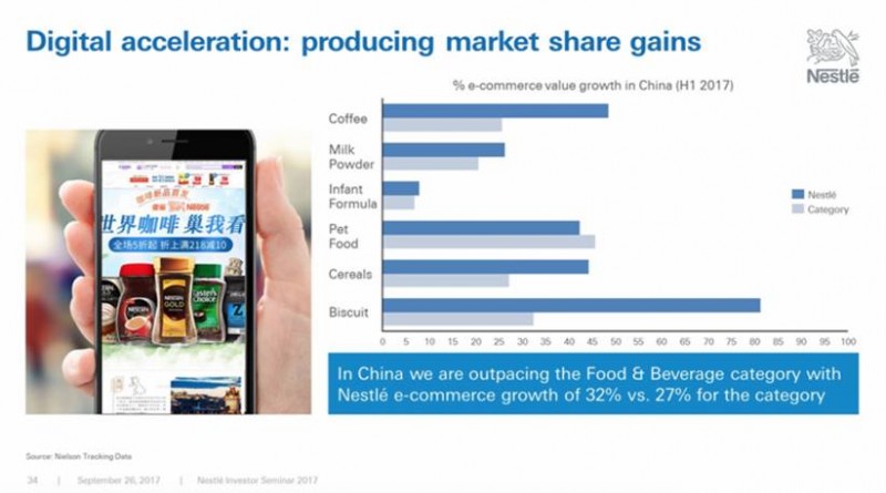 除了宠物食品,在咖啡、奶粉、婴幼儿配方奶粉、谷物麦片和饼干品类上,雀巢产品在电商上的销售额增长速度超过了该品类的行业平均增长速度。