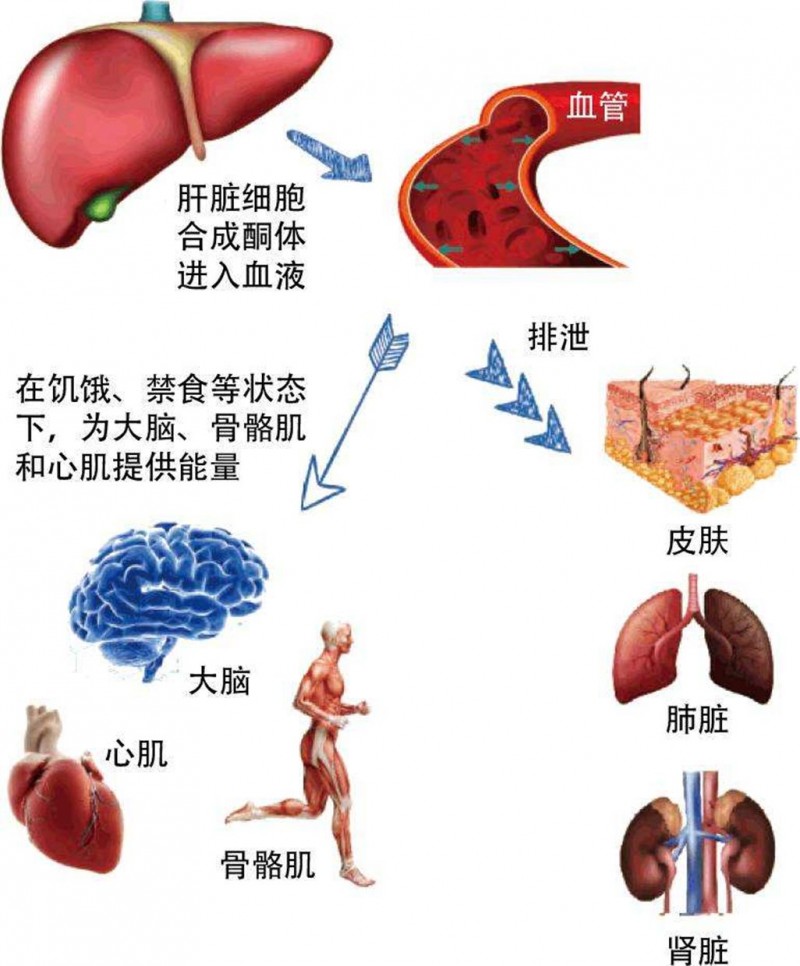 因为对于普通人,当摄入碳水化合物少于50克持续3至4天后,机体耗尽储存的糖原会逐渐通过分解大量脂肪作为能量来源,而不是分解碳水化合物产生葡萄糖供能(这也是为什么要严格保证碳水化合物极低的摄入)。分解脂肪的过程中产生脂肪酸和大量酮体,酮体在肝脏生成,经肾脏排泄,从血液流向全身各个器官组织和大脑进行供能。