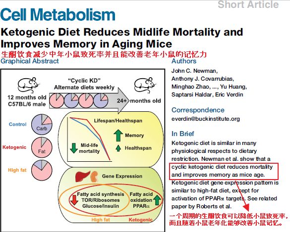 2017年9月5日,著名期刊Cell上发布了两篇针对生酮饮食的报道, 分别发现生酮饮食能够降低中年小鼠的死亡率,改善老年小鼠的记忆力,延长成年小鼠的寿命。