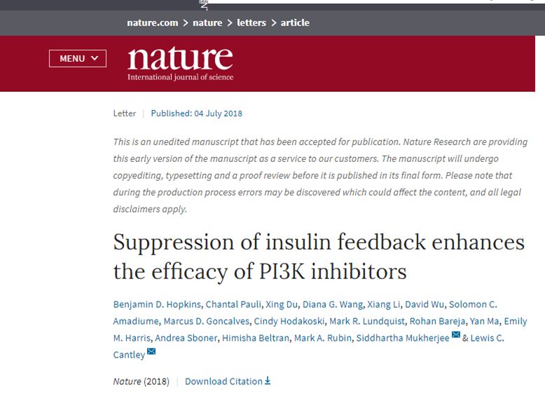 紧接着,2018年7月4日Nature上发表了一篇由康奈尔大学和哥伦比亚大学联合团队的研究,结果表明生酮饮食能够显著抑制血糖和胰岛素升高(抑糖效果甚至强于糖尿病明星药二甲双胍),增强PI3K抑制剂作用,而PI3K突变会导致癌症。