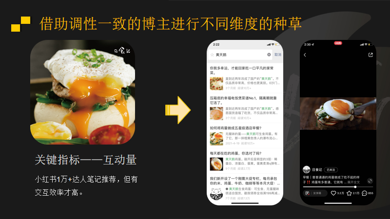 小红书的种草就是个典型的例子。我们针对年轻妈妈,连续做了两年溏心蛋挑战。在这里你可以看到,溏心蛋是非全熟状态,而且画面非常美,背后是很注重生活仪式感的一群人,它对场景、工具的选择,能相对地吻合。此外我们还很关注互动性,邀请了很多步调一致的博主,来做不同维度的种草。