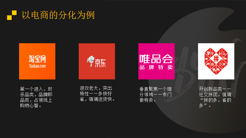举个例子,淘宝是电商的代表,是全品类;京东是利用线上超市的特性,早期从3C起步,通过切分的方式,在主干上长枝条,通过分化形成;唯品会从特卖的分支成长起来;拼多多,作为社交电商成长为新品类……它们长得都不一样,都从其中的一个功能演化而来。