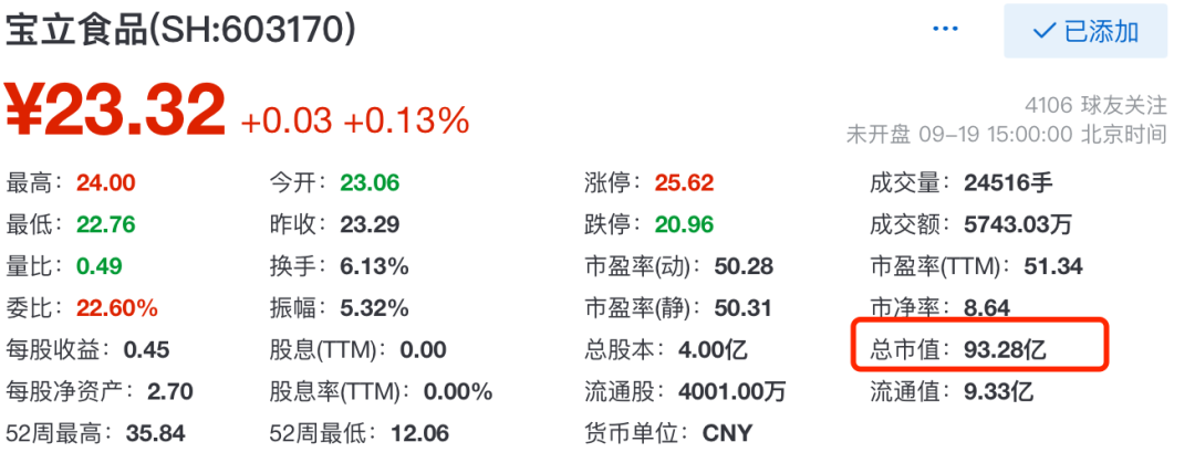 宝立食品在上市之后,在二级市场的市值一直都是比较高的,市盈率有51倍,市值有93亿元。