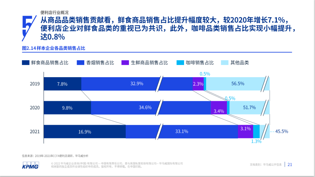 内参君近日观察到,试图“侵蚀一日五餐”场景的便利店,正在凶猛扩张。先是在一线城市加密,并通过区域授权等方式布局下沉市场。再是当小餐饮受到疫情冲击倒下后,利用释放出来的门店,加速拓展。与此同时,中国连锁经营协会联合毕马威发布《2021年中国便利店发展报告》,披露了最新的行业数据和发展趋势。报告中的几句话,也引起了内参君的关注:1、受疫情影响,消费者的需求与心理层面出现变化,减少餐馆用餐,更多选择简便轻食。2、从商品品类销售贡献看,鲜食商品销售占比为16.9%,较2020年增长7.1%。3、因早餐鲜食和晚餐外卖的增加,便利店早间与晚间销售占比有所提升。