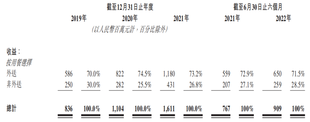 2019年、2020 年、2021年及截至2022年6月30日止六个月,达美乐中国外卖渠道收入分别为5.86亿元、8.22亿元、11.80亿元、6.50亿元,占比稳定在70%-75%之间,远高于约49%的行业平均。