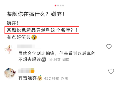 新品一出,奶茶控还没有机会喝上,就已经当场被茶颜悦色名字劝退了:看到名字有被嫌弃到,第一感觉真的不想去喝。