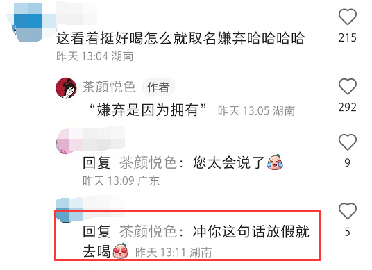 但在这次新品推广中,茶颜悦色打破了常规,公然嫌弃内涵新品不香,反而能够激发消费者的逆反心理——你越不让我买我偏要买,你越让我觉得嫌弃,我越想知道能有多嫌弃,带动消费者一探究竟,把消费者的好奇心拿捏住了