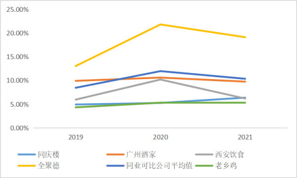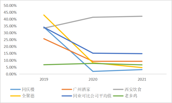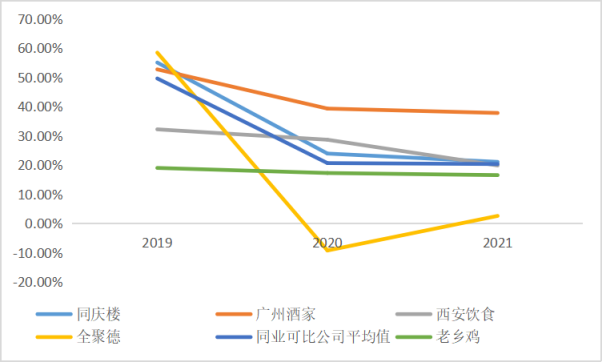 对比同业,老乡鸡的毛利率在中式餐饮行业中处于较低水平。与同庆楼、广州酒家、西安饮食、全聚德四家同行业A股上市公司相比,2019-2021年之间老乡鸡的毛利率低于上述可比上市公司综合毛利率的平均值。
